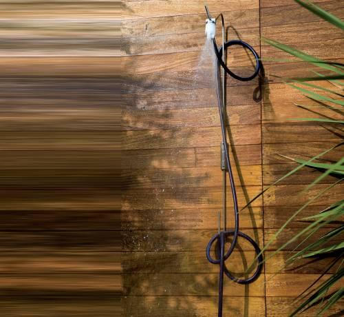 ist eine Duschgarnitur für den Garten aus Edelstahl . Es gibt sie in einer freistehenden Stand- oder Wandversion. Die Outdoordusche ist aus Edelstahlt mit einer Kopfbrause in Delrin, der herausziehbare Schlauch ist in einem speziellen Silikon-Gummischlauch in den Farben weiss, aquagrün, kobaltblau und grün erhältlich. Die Stange ist regulierbar bis zu 220cm