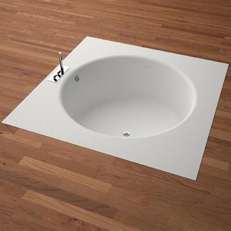 Vasca con invaso tondo in Exmar bianco o bicolore (esterno grigio scuro o grigio chiaro) o in marmo. La versione in Exmar è disponibile con bordo stretto o con bordo largo, con foro per troppo pieno. Le versioni in marmo bianco di Carrara, nero Marquina, verde Alpi o marmo Emperador dark sono complete di piletta sifonata cromata. La vasca può essere fornita anche in pietre o marmi a richiesta del cliente con costo da preventivare. Per tutte le versioni la rubinetteria può essere collocata a parete o a terra. La versione bicolore può essere realizzata con colore indicato dal cliente con maggiorazione del 15% sul costo della finitura bicolore.